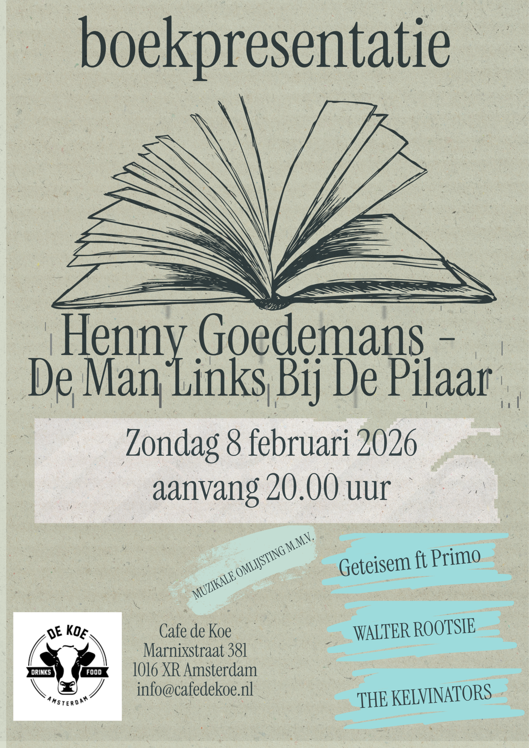 On Sunday evening 8 February 20263 Henny Goedemans is presenting his new novel “De man links bij de pilaar”. Walter is joining with two other bands for musical support during this presentation at Cafe de Koe , Amsterdam.